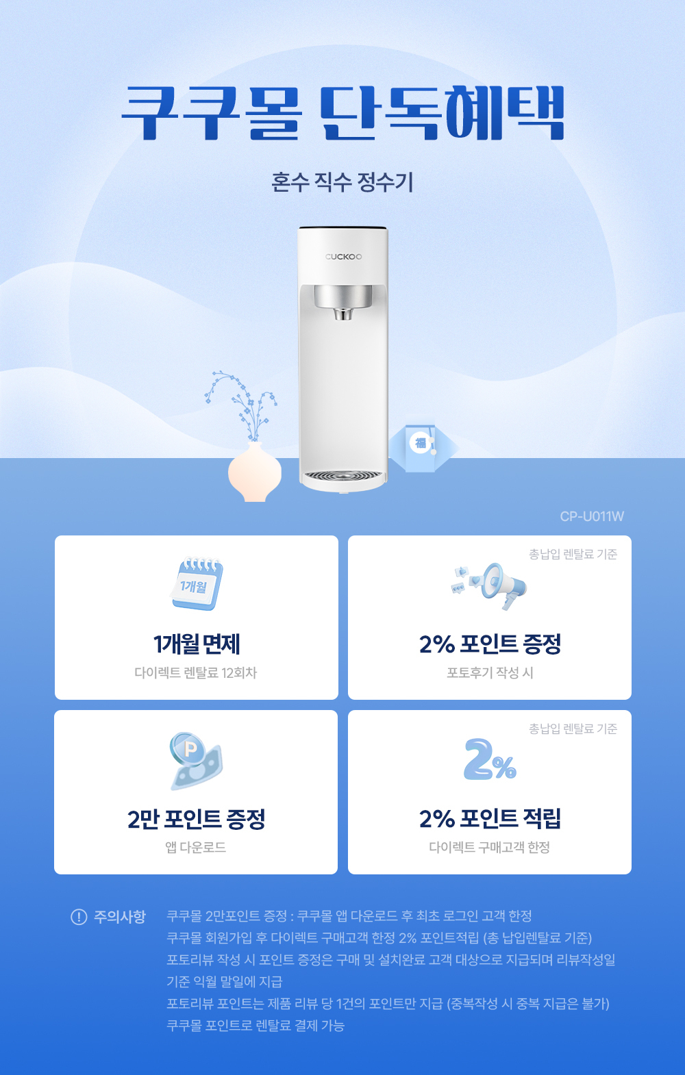 문의하신 CP-U011W 제품 정수만 나오는 직수형 정수기로