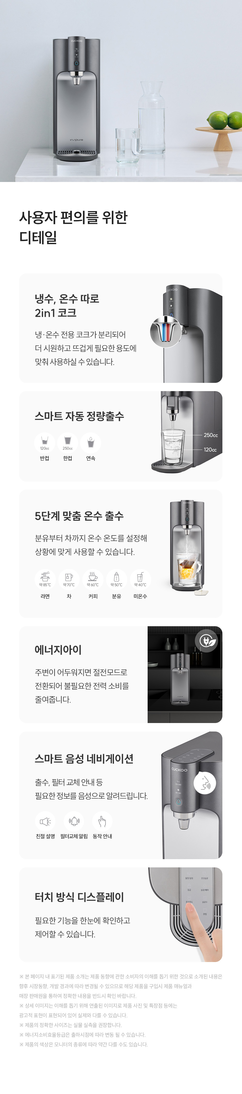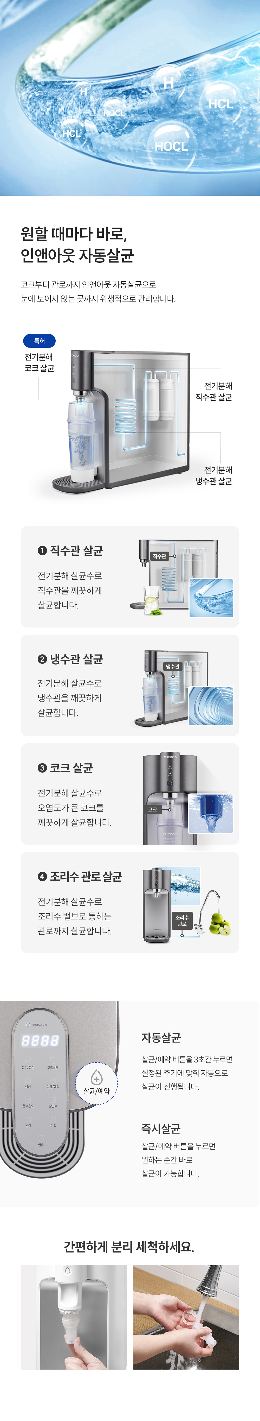 예전 모델에 비해 슬림하고 배수관 살균 기능이 있다고 하여 구매했는데 만족합니다. 다만 에너지 등급 스티커에 순간식 전기냉온수기라고만 쓰여 있어서 전기료가 얼마나 들지 가늠이 안가서 아쉽네요.