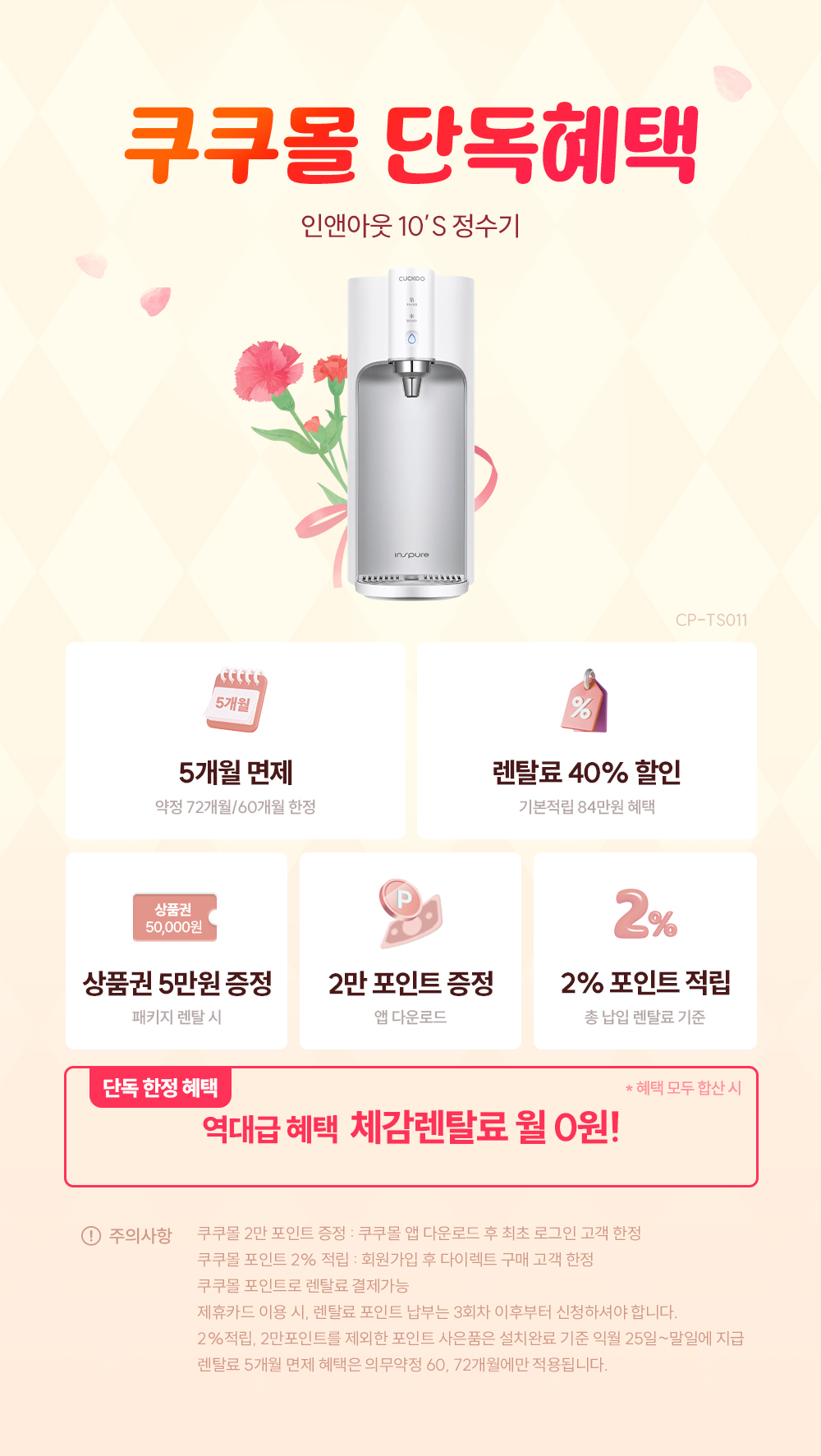 오랬동안 타정수기사용하다 이번에 쿠쿠로 바꿨어요~좋은가격과 각종 프로모션이 좋아요~또한 깔끔한 디자인에 물맛도 좋아요~