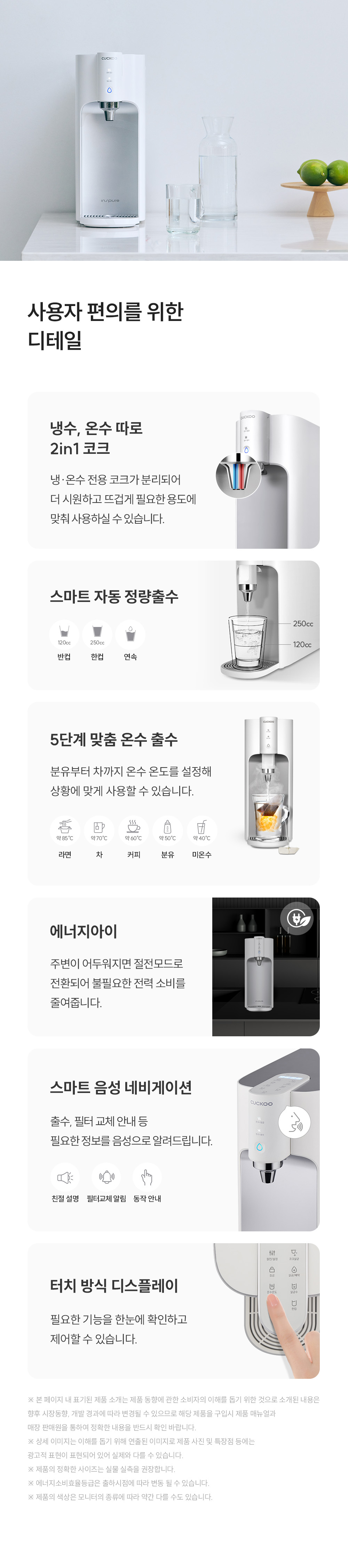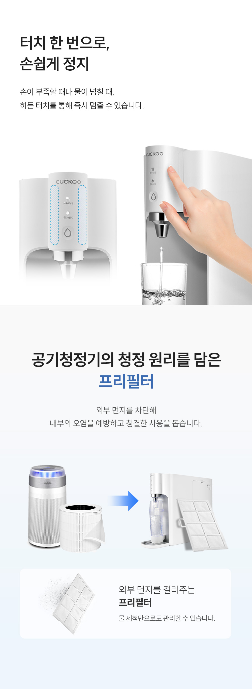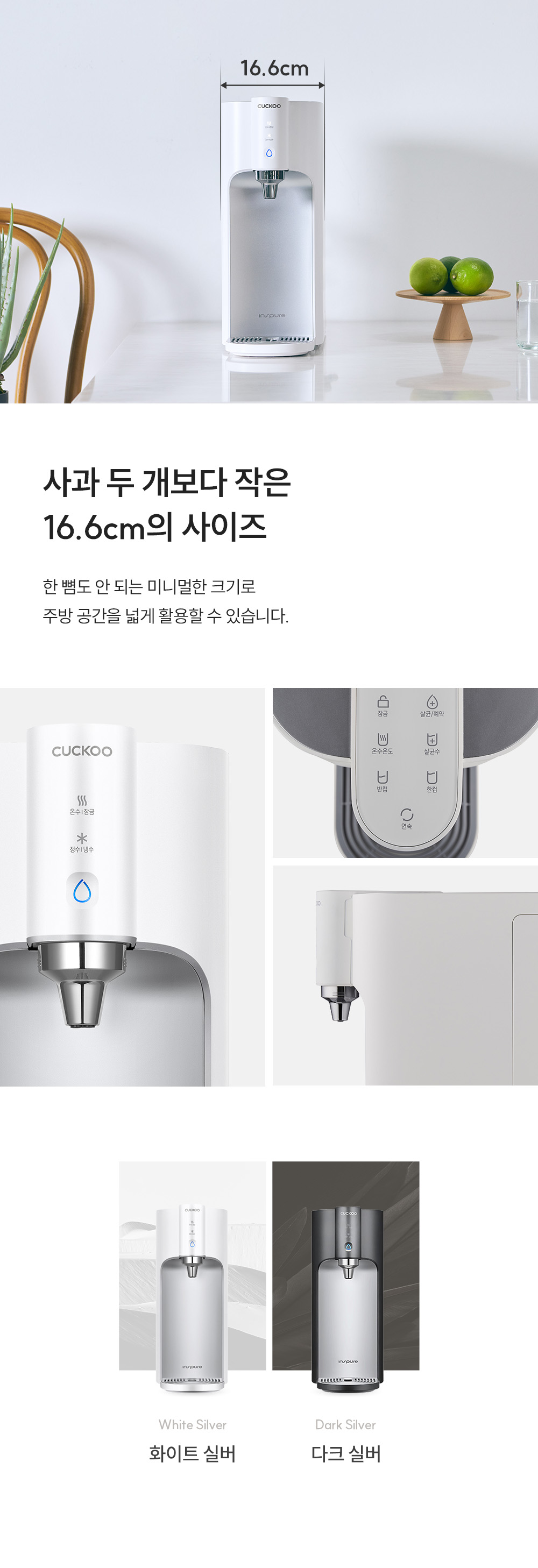 오랬동안 타정수기사용하다 이번에 쿠쿠로 바꿨어요~좋은가격과 각종 프로모션이 좋아요~또한 깔끔한 디자인에 물맛도 좋아요~