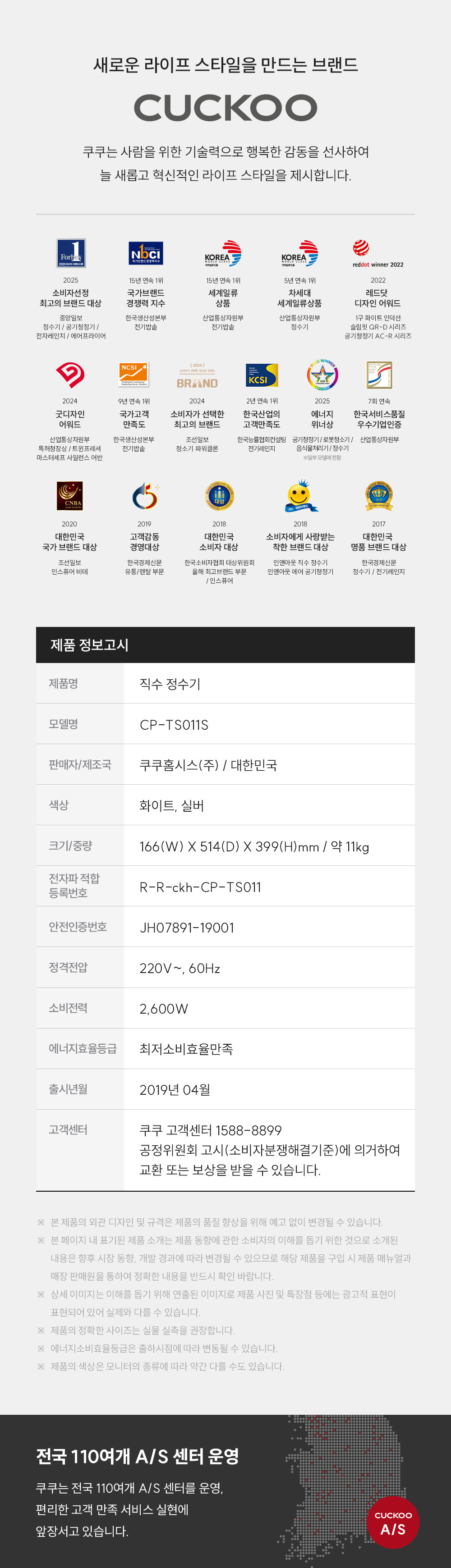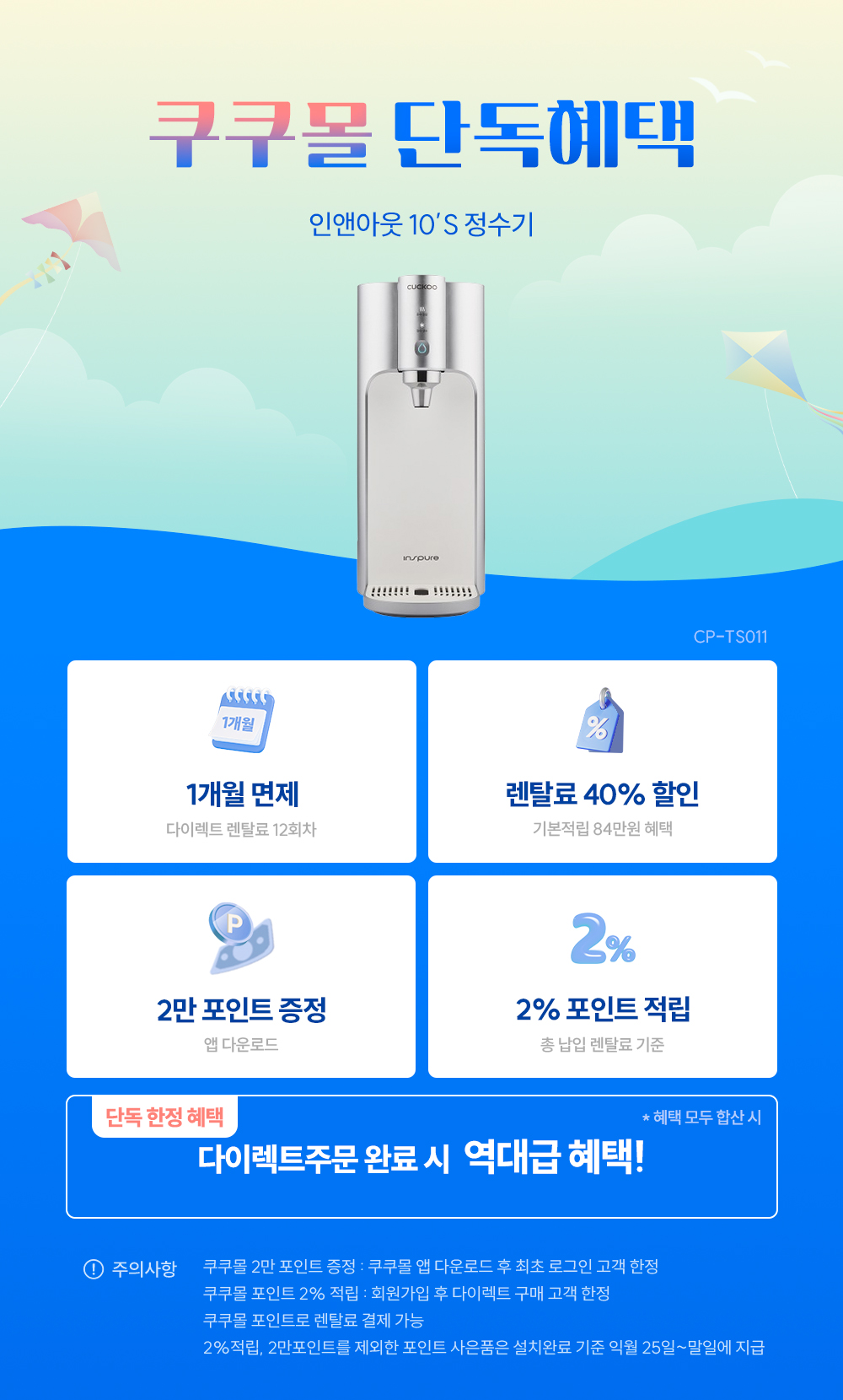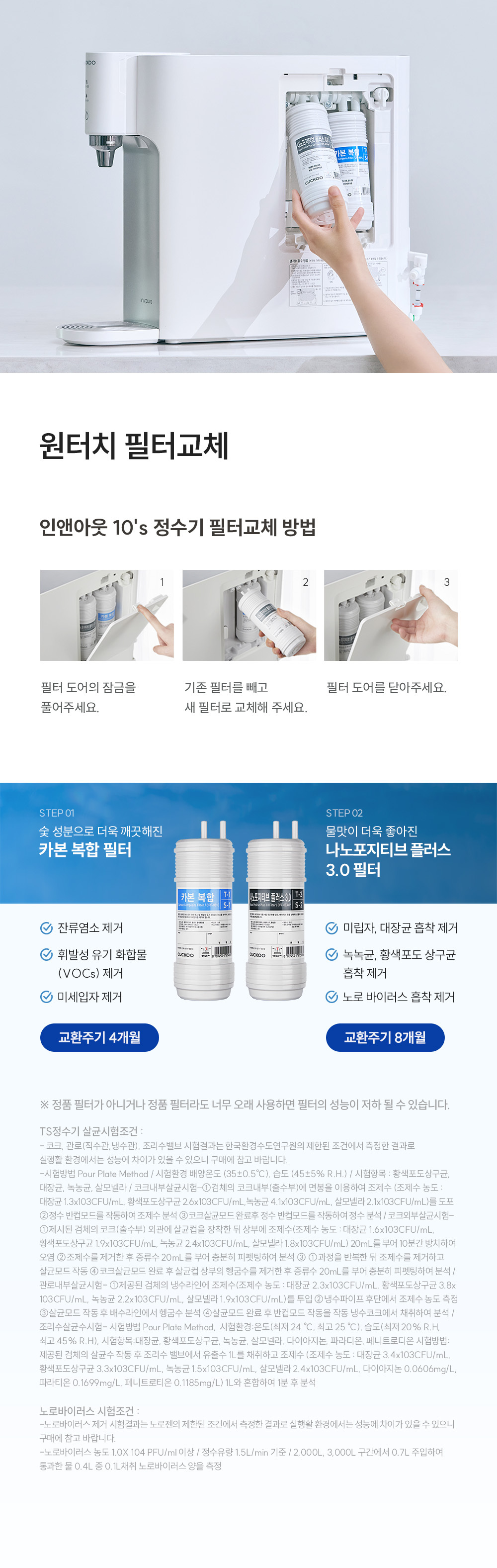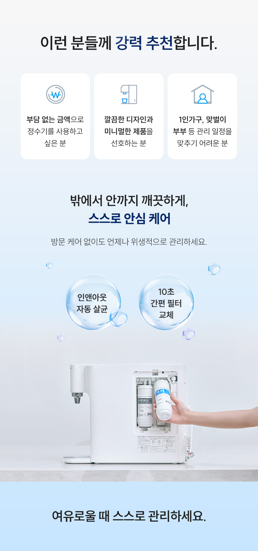 오랬동안 타정수기사용하다 이번에 쿠쿠로 바꿨어요~좋은가격과 각종 프로모션이 좋아요~또한 깔끔한 디자인에 물맛도 좋아요~
