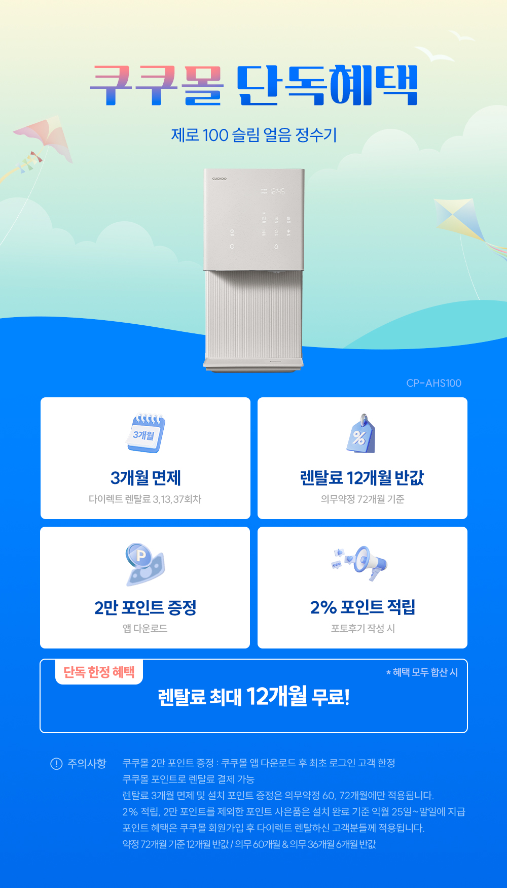 기존 쿠쿠 얼음정수기를 렌탈 대비 싼 맛에 직구매 사용했는데 3년반만에 냉각배관 고칠수 없는 고장이라고 해서 울며 겨자 먹기로 이번엔 고장나도돈나갈걱정없는 렌탈로,최신형으로 다시 쿠쿠 한번 믿어봅니다