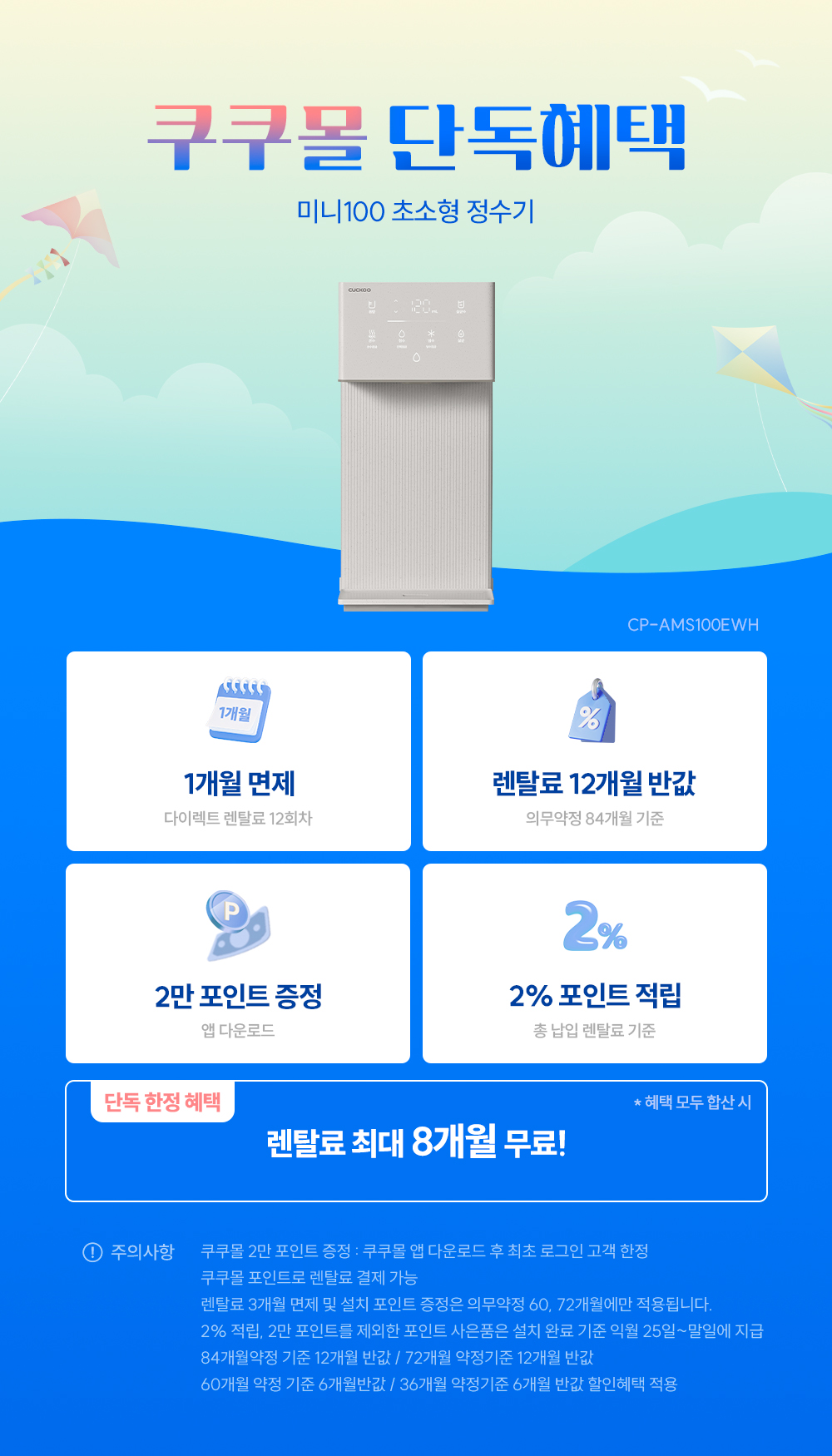 기존 타회사 정수기 렌탈기간이 종료되어 다른 제품들 둘러보다 쿠쿠의 인스퓨어 미니 100을 선택.
