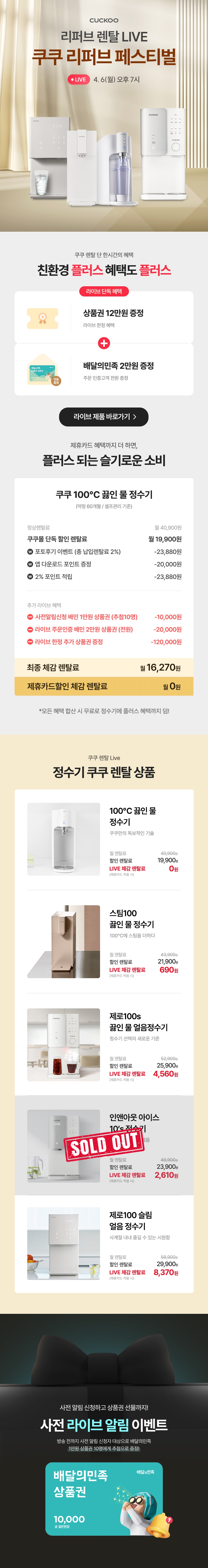 [렌탈LIVE/4월6일(월) 오후7시] 쿠쿠 리퍼브 정수기 렌탈 페스티벌